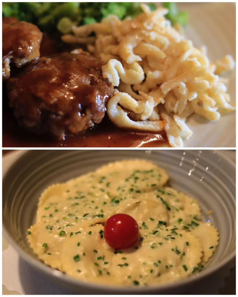 餐食讲究就地取材,我点的鹅肉饼配巴符州风格的面条,鹅就是在旁边的绿地上散养,先生的黑森林乳酪饺子,超级creamy,好吃得不得了,狂点两份!
