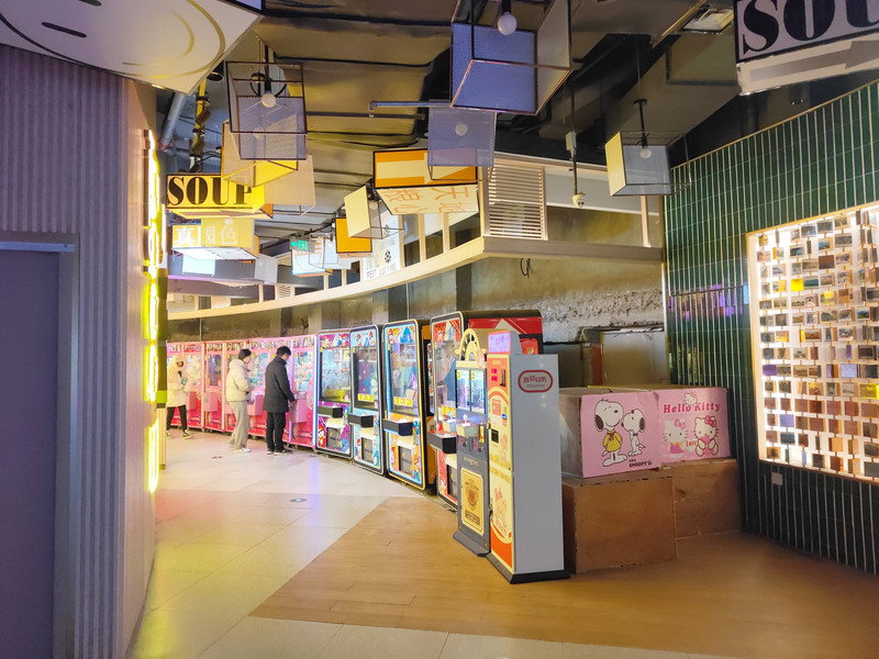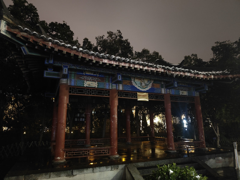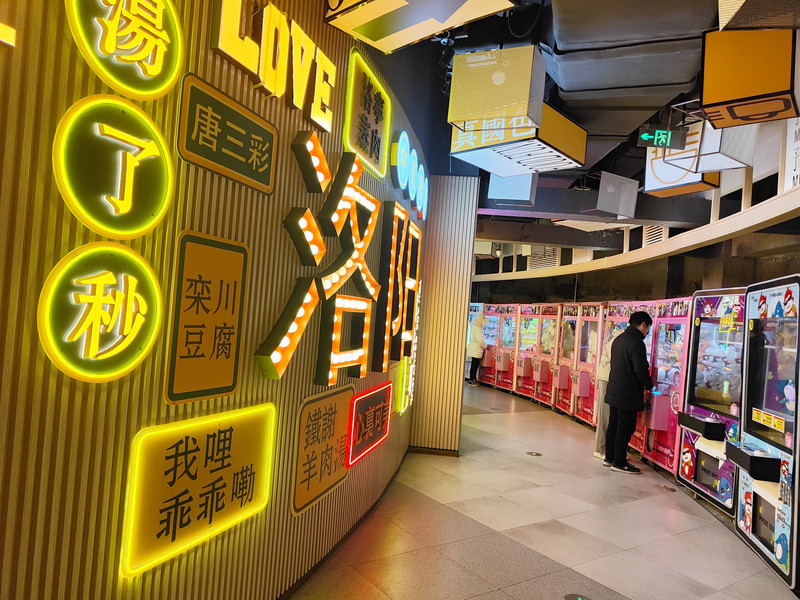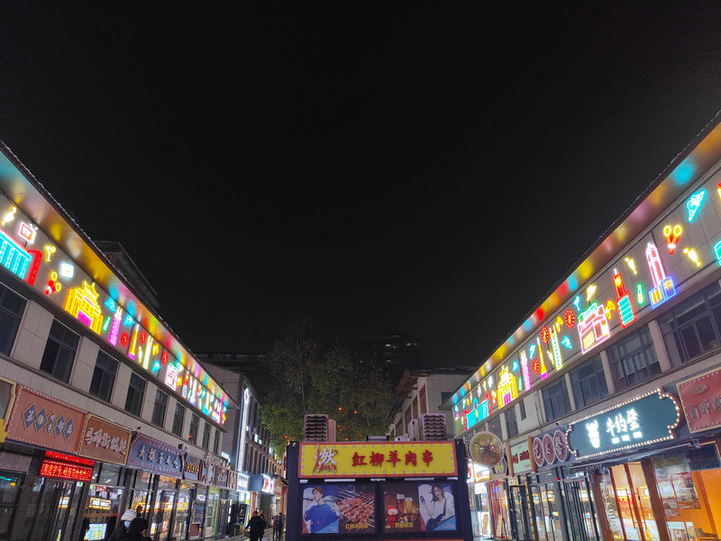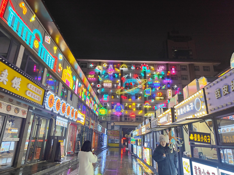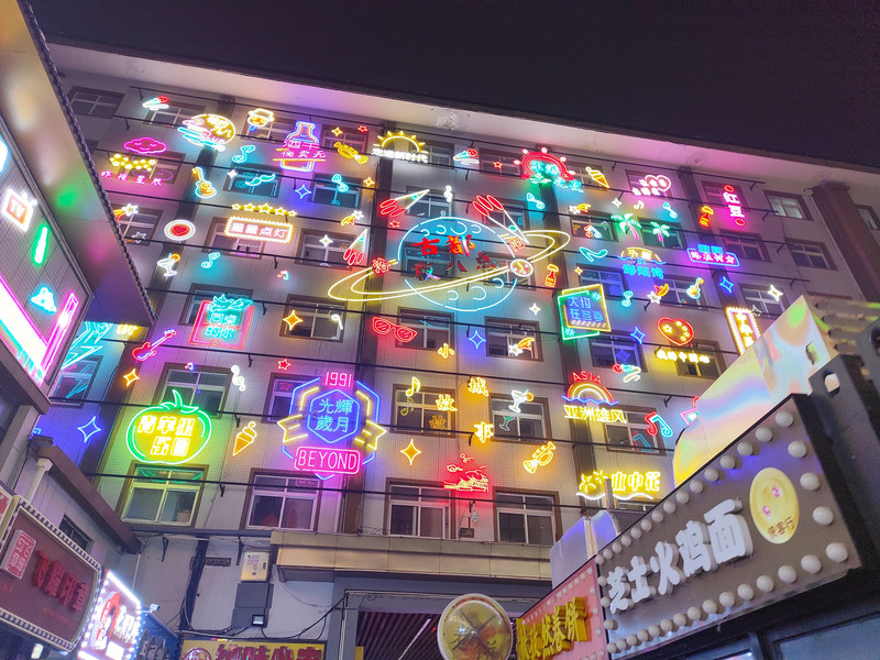 旁边的街道二楼,也是霓虹焕彩,不过只有图案,大概是一些名胜古迹和美食之类的,倒是很应景。