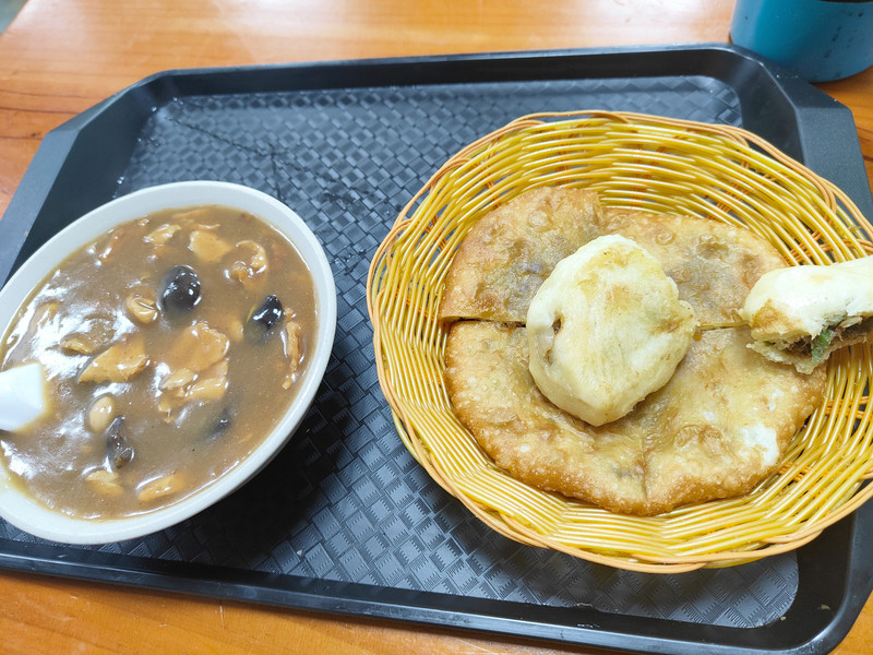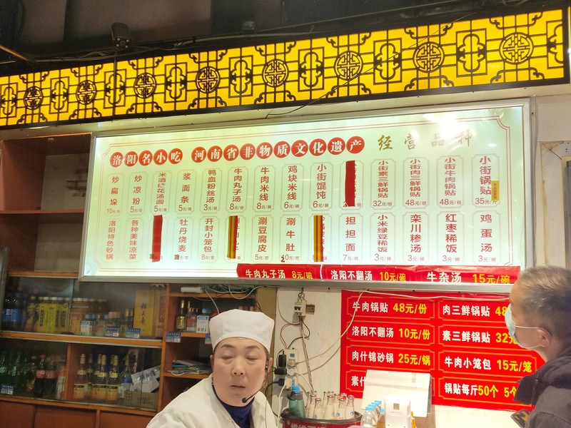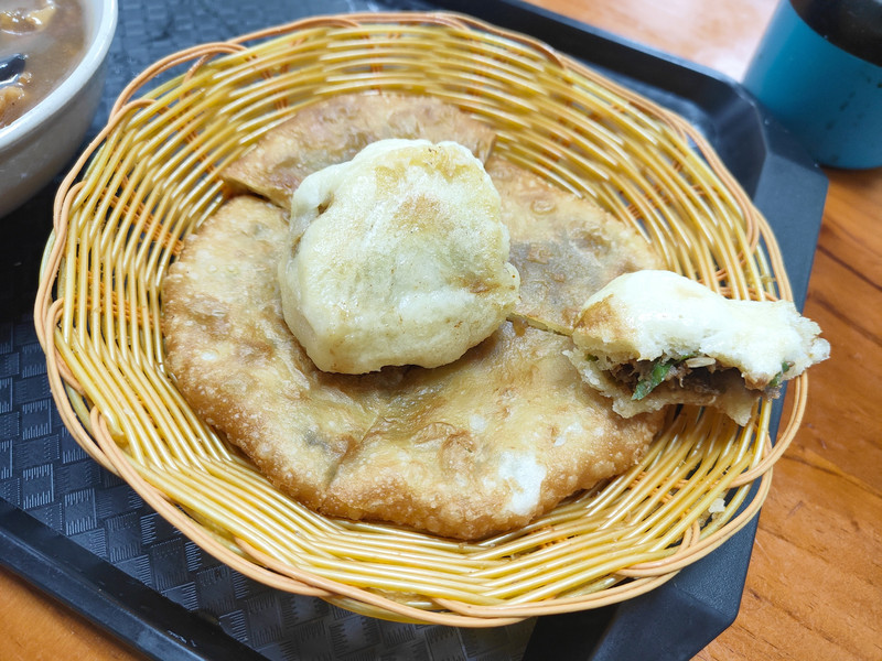 我们已经饿了,先看中了胡辣汤配牛肉盒子、牛肉水煎包。虽然洛阳的汤汤水水并不是太合我们的胃口,但寒冬里还是需要喝一碗热汤的。牛肉盒子其实就是牛肉馅饼,水煎包尤其的便宜,一块钱居然买了两个,小伙伴被这个物价惊呆了。