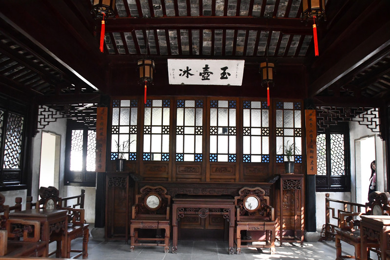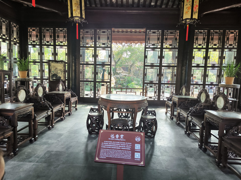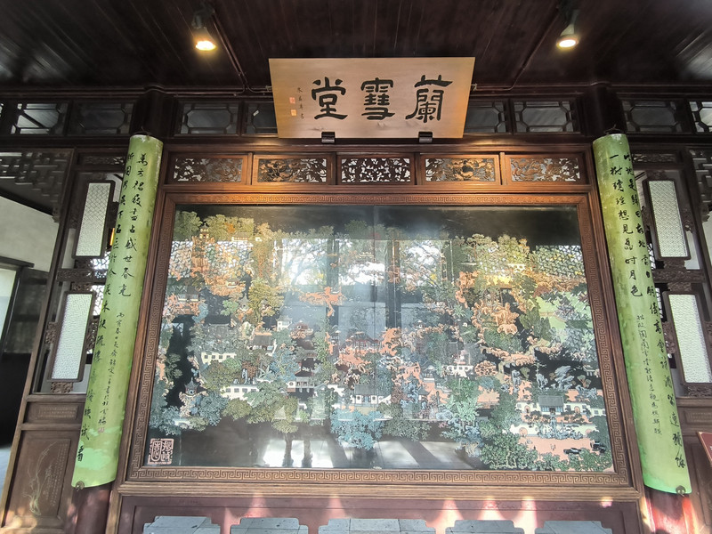 兰雪堂介绍:取李白“独立天地间,清风洒兰雪”诗意而名,堂中南面置漆雕拙政园全景图,北向饰翠竹图。