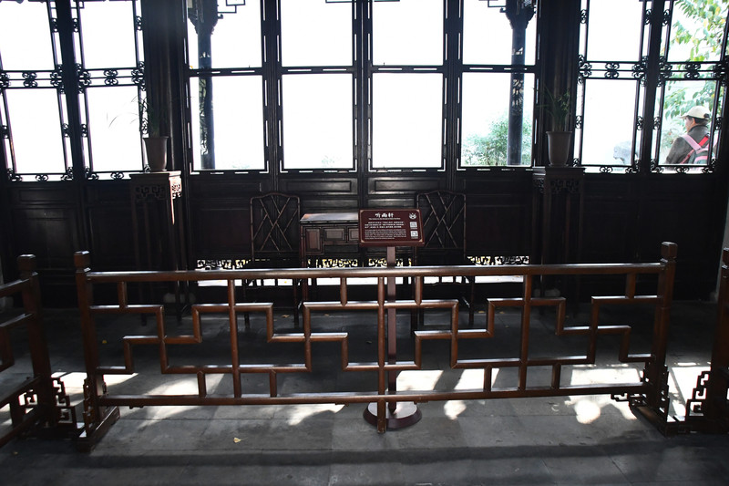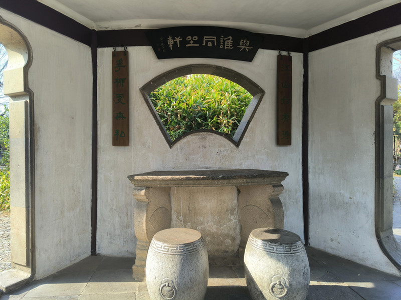 与谁同坐轩介绍:小亭非常别致,修成折扇状。苏东坡有词“与谁同坐?明月、清风、我”,故名“与谁同坐轩”。轩依水而建,平面形状为扇形,屋面、轩门、窗洞、石桌、石凳及轩顶、灯罩、墙上匾额、半栏均成扇面状,故又称作“扇亭”。