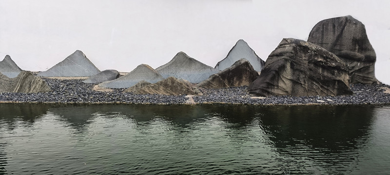 走在石桥上可欣赏这副在白墙下用砂石堆砌而成的画,山、石倒影在水中,宛如穿越前方的名山大川。
