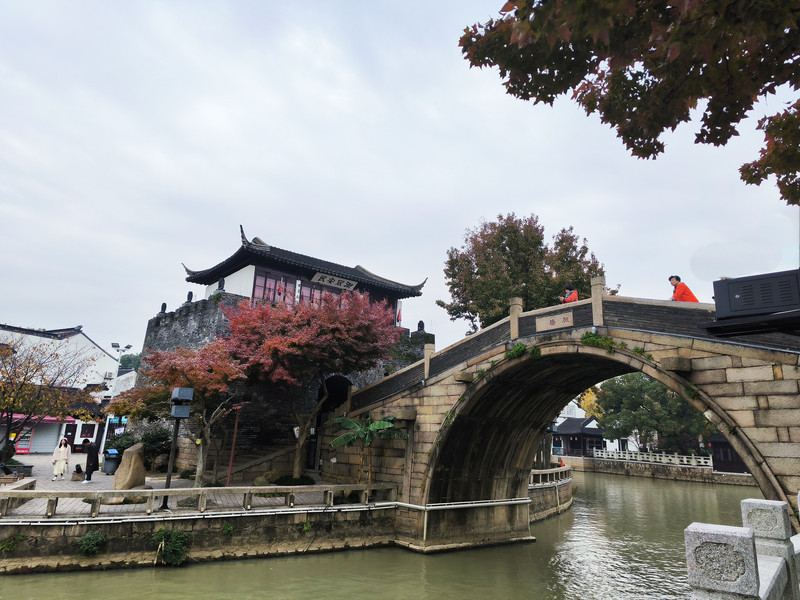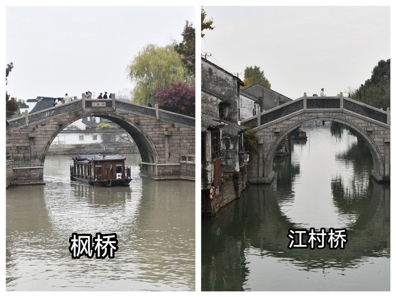 枫桥是一座横卧在古运河上的单孔石拱桥,与寒山寺前的江村桥遥相呼应。《枫桥夜泊》:"月落乌啼霜满天,江枫渔火对愁眠”中的“江枫”指的是江村桥和枫桥。