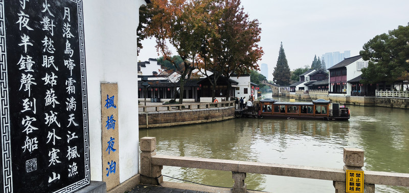 这里是当年张继客船夜泊处,张继的名诗《枫桥夜泊》刻于此是由明初著名书法家沈度所书的真迹。明初书法家沈度是最早书写《枫桥夜泊》的名家。