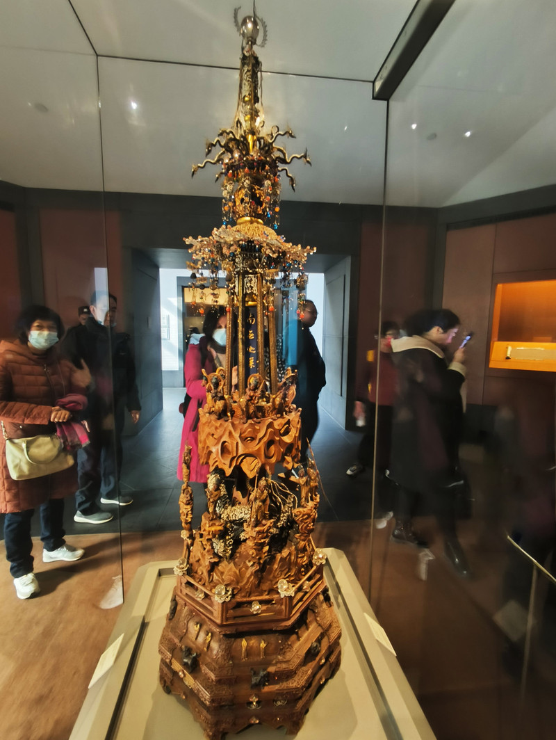 真珠舍利宝幢介绍:1978年在苏州瑞光寺塔第三层天宫中发现,存放在两重木函之中。黑色外木函正面有两行白漆楷书“瑞兴院第三层塔内真珠舍利宝幢”。内函四壁彩绘四大天王,内壁墨书“都勾当方允升妻孙氏十娘”等题铭和“大中祥符六年四月十八日记”等题记,证之为北宋遗物。宝幢主体部分由楠木制成,分为须弥座、幢殿、刹三部分。两件镇馆之宝之一。