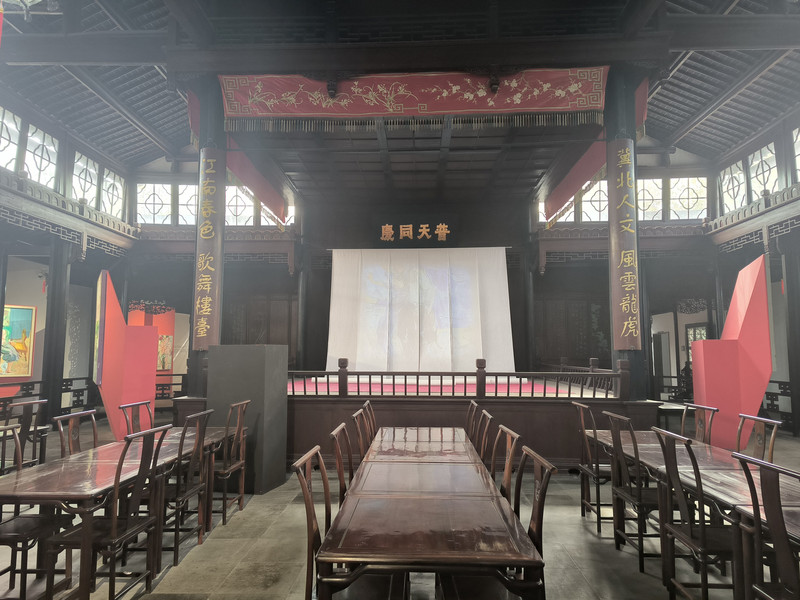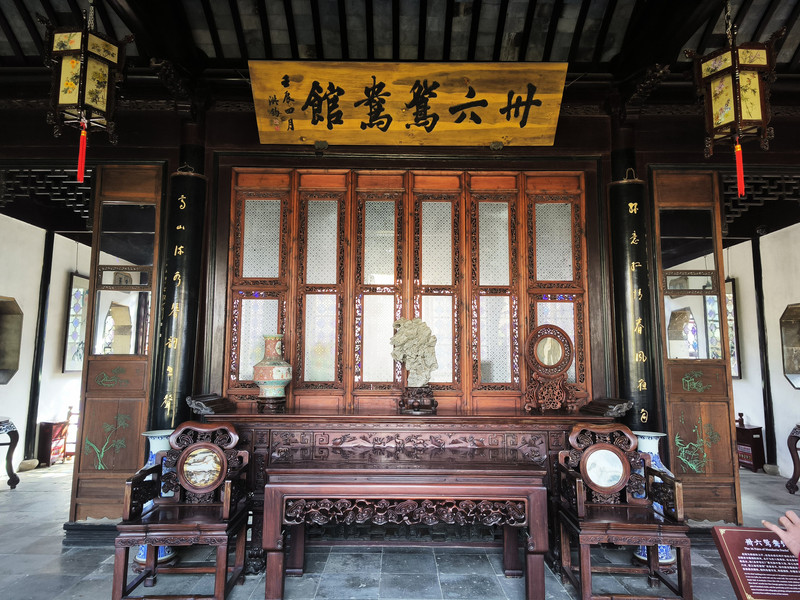 卅六鸳鸯馆(十八曼佗罗花馆)介绍为西花园的主体建筑,精美华丽,厅内以隔扇和挂落划分为南北两部分。南部称“十八曼佗罗花馆”,北部名“卅六鸳鸯馆”,这是古建筑中的一种鸳鸯厅形式。 南厅因曼陀罗花即山茶花,而得名。北厅因临池曾养三十六对鸳鸯而得名。卅六鸳鸯馆内顶棚采用拱型状,既弯曲美观,遮掩顶上梁架,又利用这弧形屋顶来反射声音,增强音响效果,使得余音袅袅,绕梁萦回。