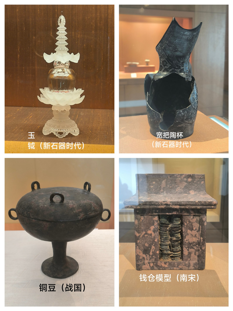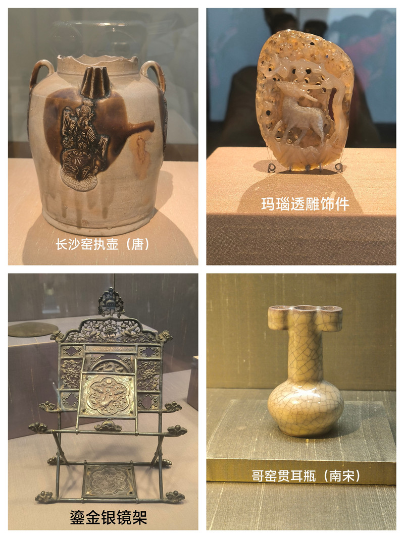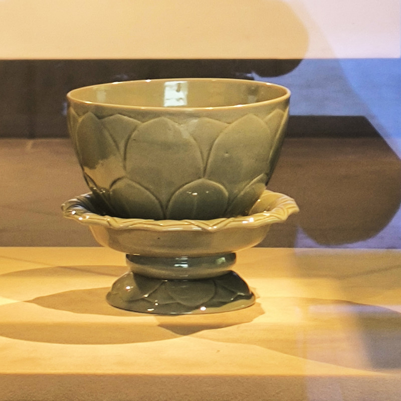 越窑秘色瓷莲花碗由碗和盏托两部分组成。碗身外壁、盏托盘面和圈足均饰重瓣莲花,如浅浮雕状凸起,恰如一朵盛开的莲花,造型工致,端庄有姿,釉色捩翠融青,莹润内敛,呈现出美玉般的温润感,就如陆龟蒙所写“九秋风露越窑开,夺得千峰翠色来”,秘色瓷莲花碗被定为五代秘色瓷标准器和代表作。两件镇馆之宝之一。
