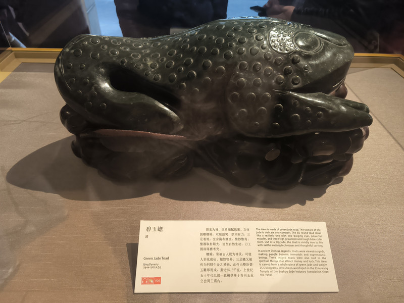 碧玉蟾介绍碧玉为材,玉质细腻致密。立体圆雕蟾蜍,双眼鼓突,肌肉有力,三足着地,全身满布瘰疣,惟妙惟肖。整器取材硕大,造型自然生动,刀工圆润、琢磨考究。蟾蜍常被古人视为神灵,可使人羽化成仙、超然物外,三足蟾又被传为利财生金之灵物。此件由整块碧玉雕琢而成,重达25.5千克,上世纪五十年代以前一直被供奉于苏州玉业公会周王庙内。
