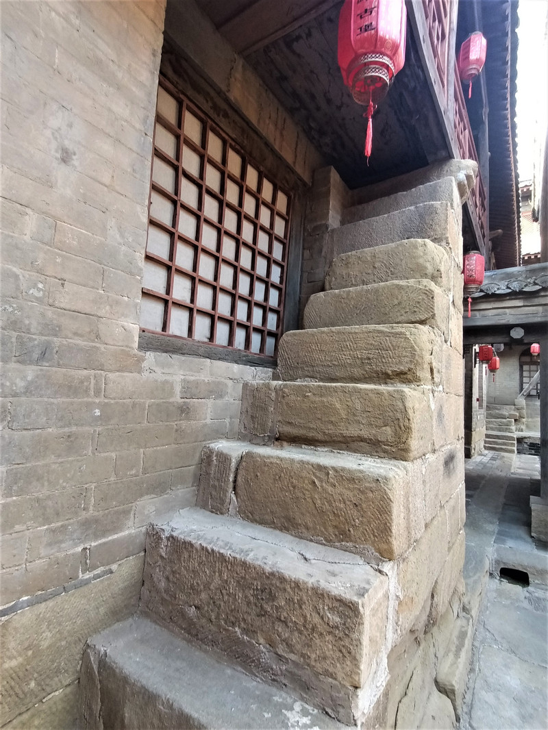 登石梯上楼,楼上有一块盖板,如果不打开这块板,下面的人是上不去的,起到了很好的保护作用。