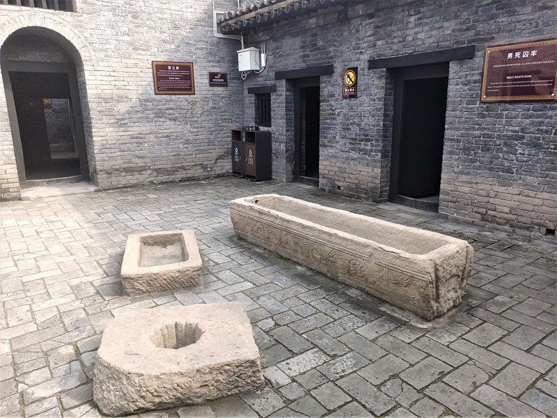 死囚牢内是一封闭的小四合院。院心的这眼小井称为“苏三井”,苏三在这里打水,还在旁边的黄沙石凿成的石槽中洗衣服。这眼井深约两米,井口很特别,仅在一块三四十厘米厚的大青石中间凿碗口大的孔,直径约23厘米,人无法把头伸进洞中,是专门为防止囚犯投井自杀而设计的。“监狱”里每天还在固定时间免费为游客表演“苏三起解”等节目。
