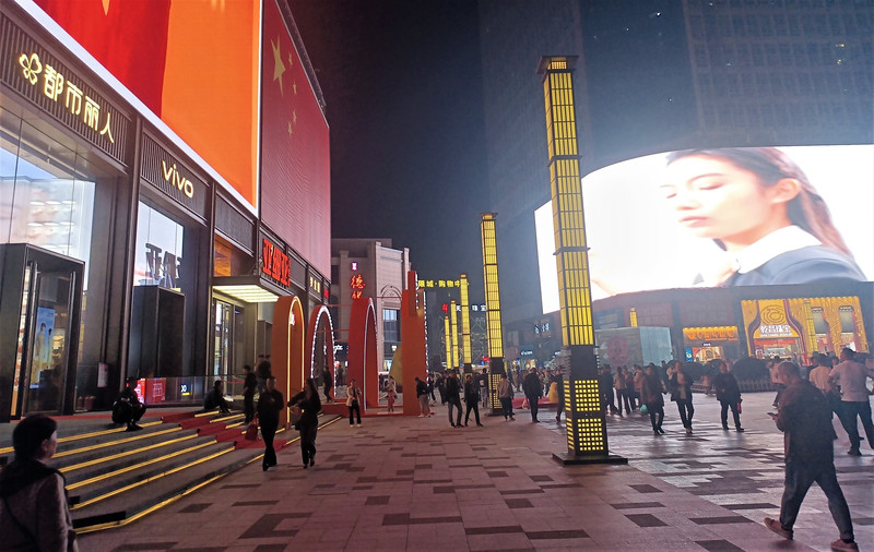 广场中央高大的二七纪念塔,不同颜色的霓虹灯变换闪烁,装扮着广场的夜色,烘托着广场的气氛。华灯初上,夜生活才开始。马路上车水马龙,路人匆匆而过。广场一边的大厦灯火通明,巨幅广告屏像约好似得,配合二七纪念塔不时地变换广告画面和色彩。