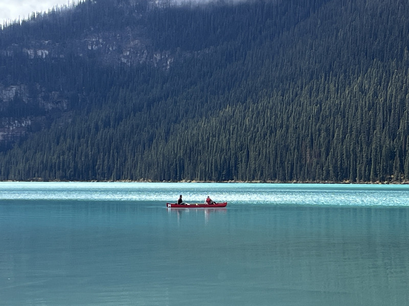 班夫国家公园是加拿大最大的公家公园,最有名湖是路易斯湖,可惜当天气温很低而且开始下雨有时还飘着雪花,太冷没能实现在路易斯湖划船的愿望,只好沿着湖步行了一段,虽然阴天但路易斯湖仍然呈现出翠蓝色,像一块翠蓝色玻璃映衬着山水间;临湖而建的费尔蒙城堡酒店是班夫国家公园最高档的酒店了,游客特别多,在这里吃饭要预约,买咖啡上卫生间都要排队