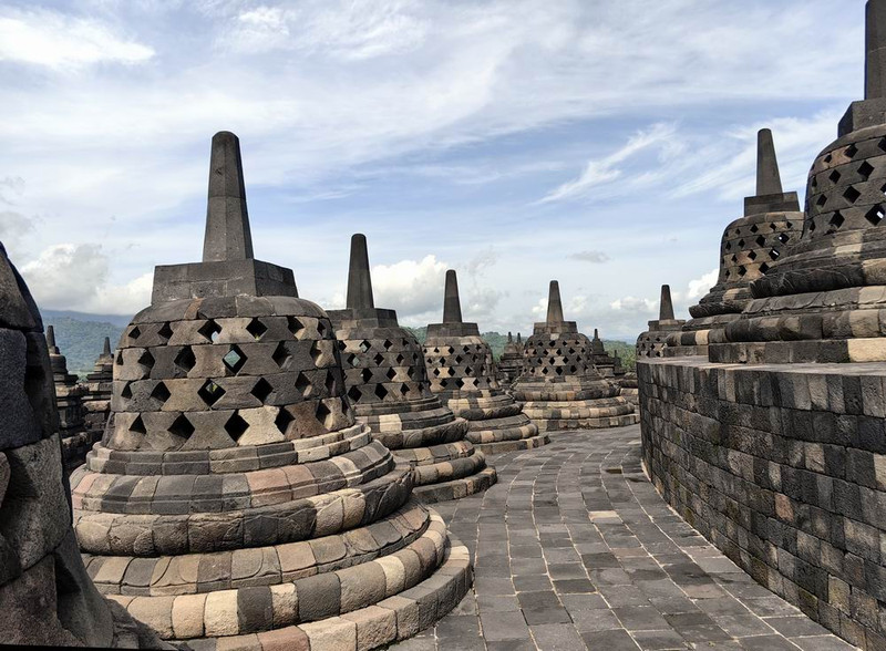 后来因为火山爆发,使这佛塔群下沉、并隐盖于茂密的热带丛林中近千年,直到19世纪初才被清理出来。照片摄于婆罗浮屠。