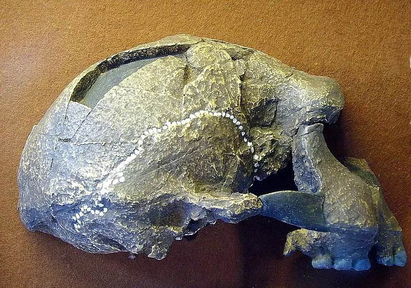 1969年,爪哇岛上的一个农民在耕地是,意外地用棍子敲打到一个头骨,在这头骨上敲出一个小洞。照片摄于桑义兰早期人类遗址 。