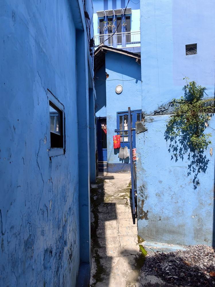 而被这边的彩虹村迷乱了眼,不妨到另一头的蓝色村去放松放松。与彩虹村的“创意长廊”相比,蓝色村更像是一座迷宫。照片摄于蓝色村。