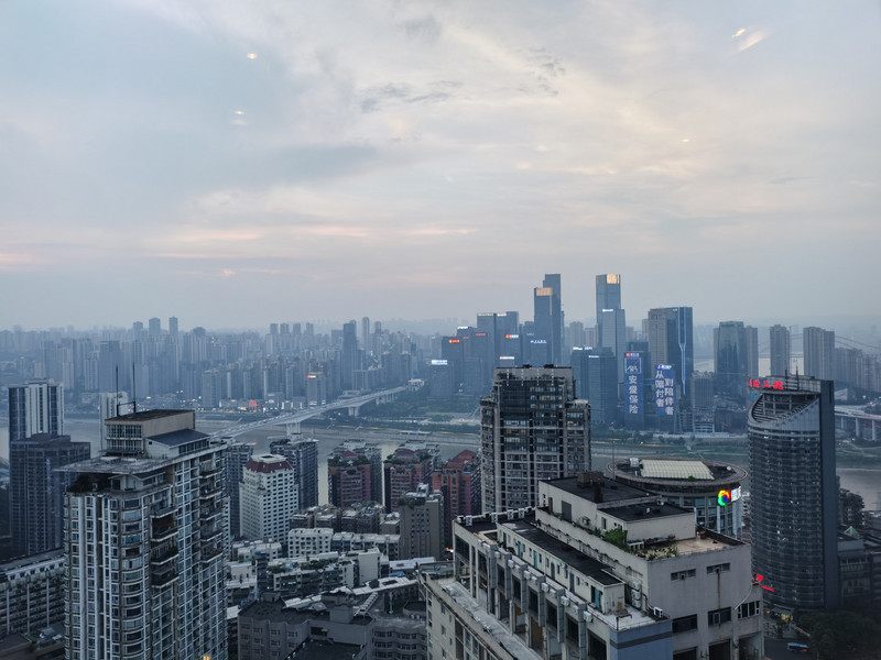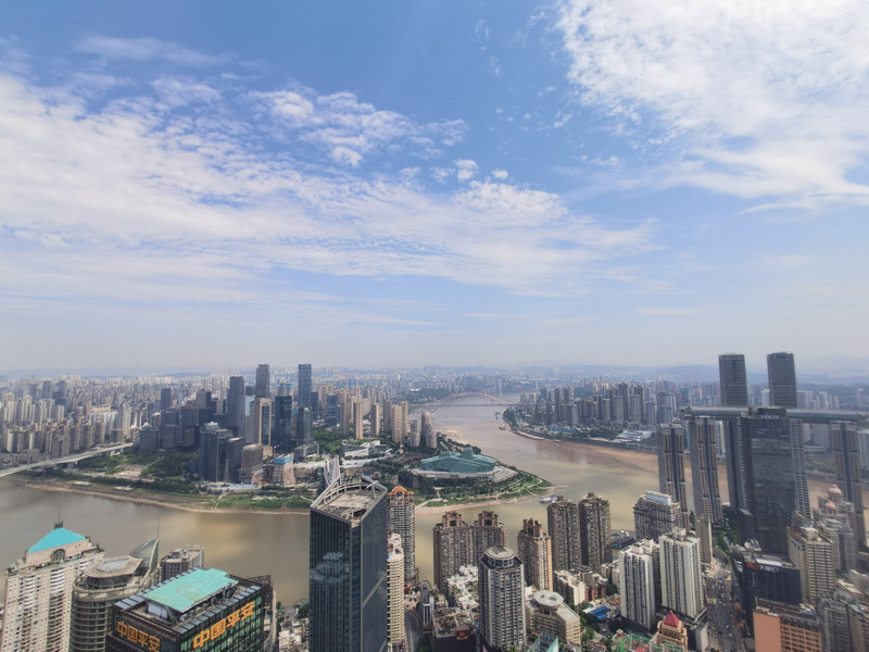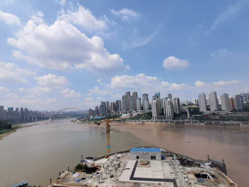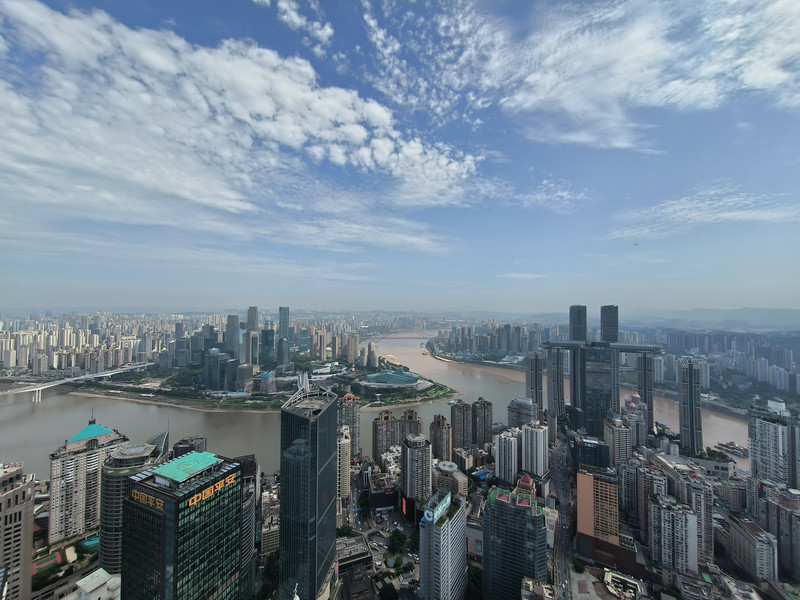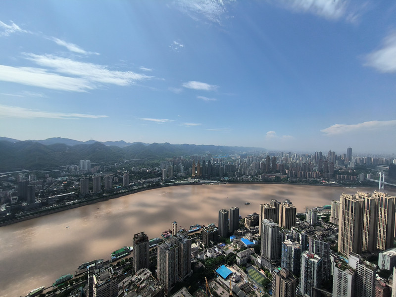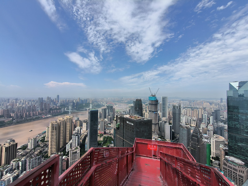 直升机平台四周毫无遮挡,直接远眺大重庆。东北望去不远处,就是渝中半岛尖端的朝天门来福士标志性建筑,以及朝天门前的长江和嘉陵江两江汇流,不尽长江迤逦远去,想着大江尽头的家乡,江头江尾之感油然而生。