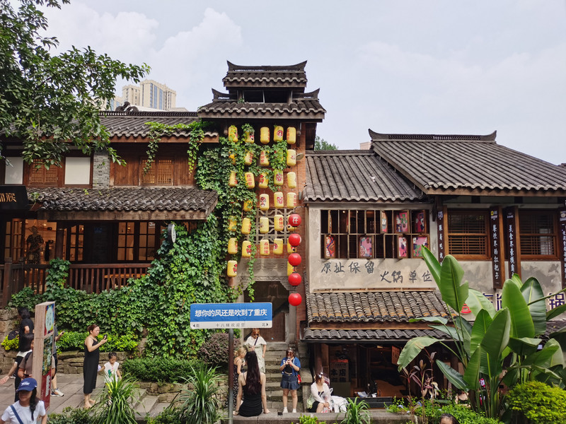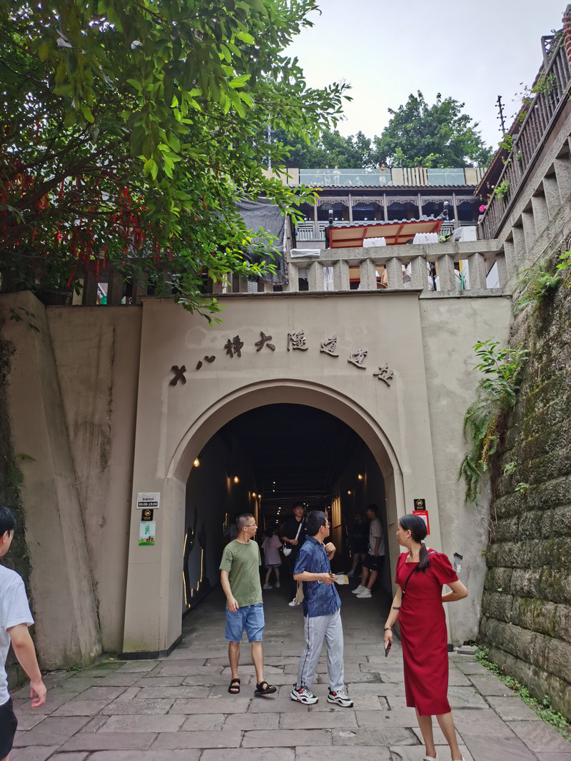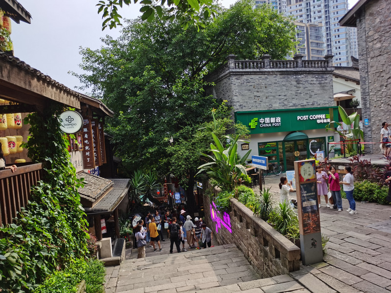 在咖啡馆坐着的时候研究下一步,看到不少推荐十八梯的,路也近,于是决定去那儿。从来福士回到地铁站,1号线坐两站到较场口,从十八梯的出口出来,就可以看见这个山城特色的山坡。渝中半岛分上下城,解放碑、较场口等所在在地势高的上城,江边地势低,是下城。十八梯就是从上城往下城去的一片山坡,一路石阶下山,整个一片地方被改造成保持原有风貌的商业民宿街区。从地铁出口的山顶,顺着台阶向下走,两侧都是各式餐馆、店铺,日本清水寺前二年坂也有这样的味道。沿着石阶,走不几步就有个邮局,邮局旁有十八梯的历史沿革展览,可以歇歇脚,看看。