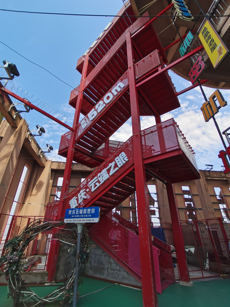 云端之眼其实就是解放碑不远的一座“联合国际写字楼”顶楼观景平台,名字看着差点以为很高大上。从酒店对着地图走着就过去了。写字楼就挨着长江索道上站,门前马路车子堵的厉害,无数人去长江索道排队。我们拐进写字楼,按指示标牌坐电梯上到67层,预先在手机上就买了门票,67层是一个室内观景台,有喝的,可以休息,顺着地标走出室外,一座红色楼梯,直上69层的直升机平台。