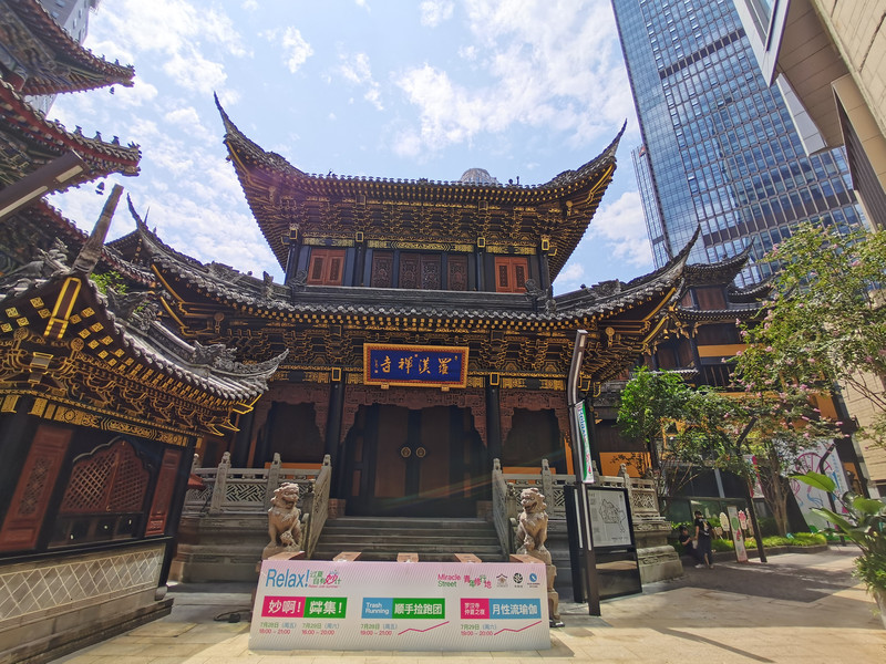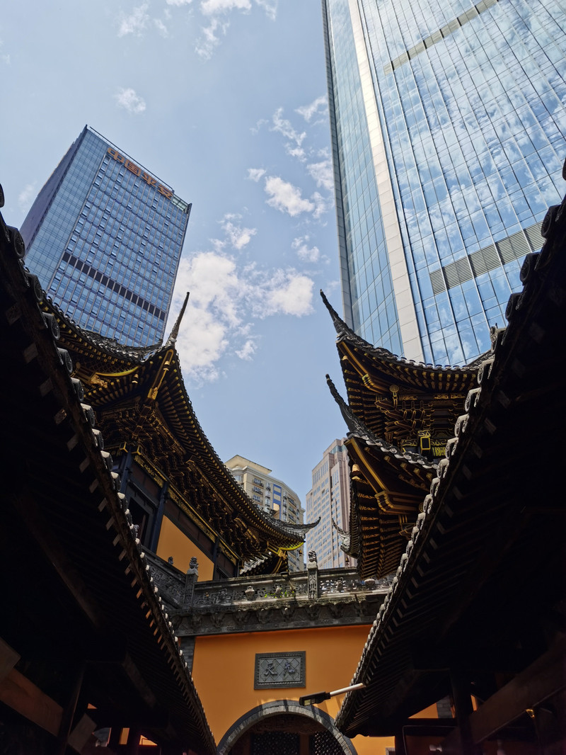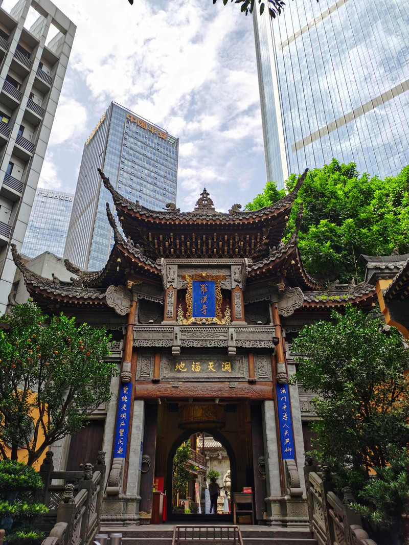 平台上实在太晒了,拍够了照片,走回67楼坐下休息一会,回到楼下继续行程。从云端之眼往北走,不多远就是掩藏在高楼中的罗汉寺。从《疯狂的石头》里知道了罗汉寺,多年以后终于可以看看这个案发之地。20块钱门票,在重庆森林的局促地盘中能保留这样一处清净之地还真是难得。