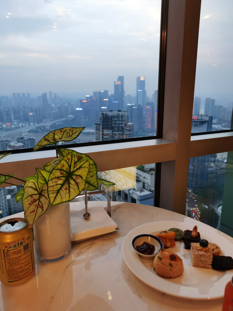 十八梯顶上有个茶颜悦色,不过照例排长队,从较场口转盘边上就有一家蜜雪冰城,还是这个实惠。边走边喝,穿过热闹的解放碑街区步行回到酒店。因为酒店有赠送茶点,就又去酒店顶楼酒吧坐坐,吃几块点心,看看嘉陵江对岸傍晚的CBD。第二天是来之前就预约好的钓鱼城之行,所以晚上不需要动脑子研究行程,躺在床上恢复脚力和体力。