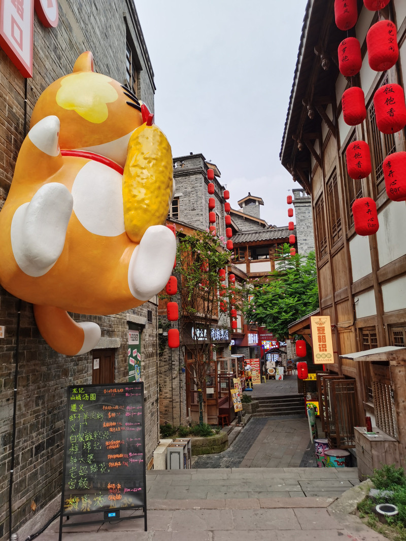 从山坡下到一片小广场,有一口喷泉井水,可以玩玩水,洗把脸,凉快一下。人太多,我们就往两侧小巷里走走,在街区东侧外沿看到一家老字号的重庆小面,来一碗小面、一碗冰粉休息一下,店里没有其他客人,老板跟我们聊天,吐槽门口虽然已经修好但始终没有通车的马路和路对面的烂尾楼盘给小店生意带来的深远影响。