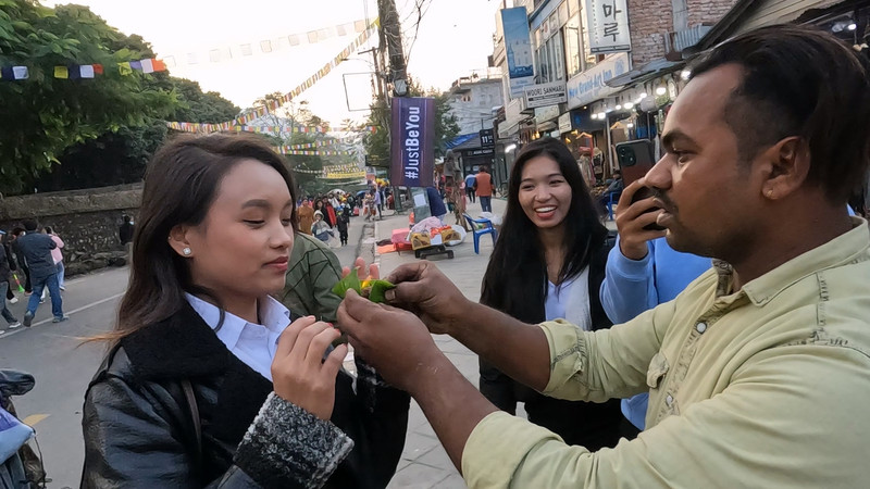 当迎着一路黄土,终于在博卡拉下车的那一刻,完全进入了另一个氛围。费瓦湖边的湖滨区步行街上,聚集了很多人,和加都那种发动机轰鸣嘈杂不同,这里更多是街边的音乐交织着行人的欢笑声。走五步有小贩沿街叫卖着水果饮料、火烧槟榔,走十步有人音响放歌临街起舞。