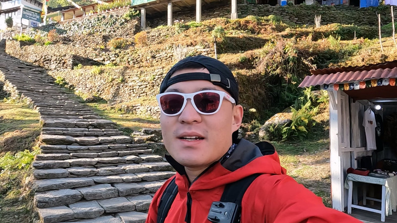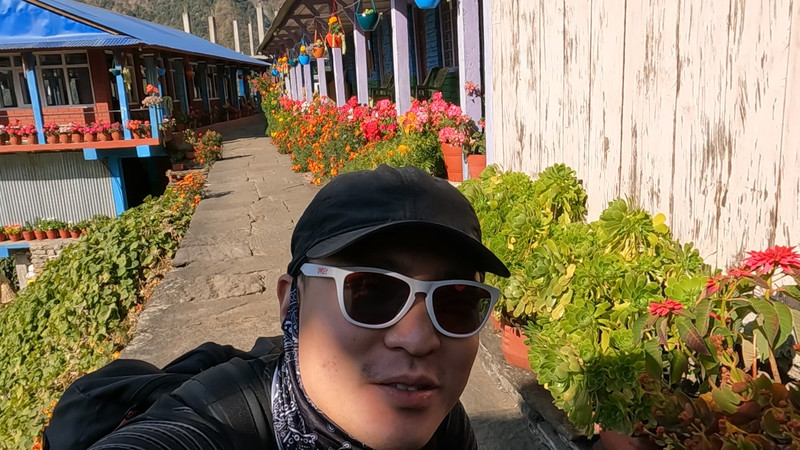 踏上安娜普尔纳的土地,我们的徒步之旅正式开始!今天的行程出奇的简单,从jhinudanda出发,有一个390米的爬升就能到达今天的目的地chhomrong。一路上都是很成熟的石阶路,连接着山里的每个小村落。每一个村里面都是用木头和石头装饰的房屋,看起来古朴又自然,每家每户都会用很多花来装点,透露出一种由内而外的精心。今天的行程非常轻松,所以先不慌不忙的吃个饭。