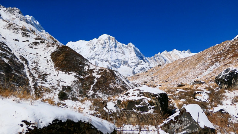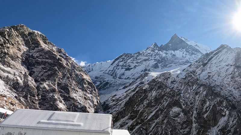 雪后的山路非常的安静,山谷里满是一片银装素裹。路面倒没有想象中的危险,因为刚刚下雪后还没有融化结冰,因此雪地的摩擦力还比较大,但要是出现冰面还是建议戴上冰爪走。大约2小时左右,就会到达途经点,海拔3700米的MBC(Machhapuchhre Base Camp)鱼尾峰大本营。走到这里,前两天一直遥望的鱼尾峰将毫无保留的呈现在面前。鱼尾峰本身造型就很独特,受到漫长的冰蚀作用,陡峭的山体上有两个相近的峰顶,仿佛像是鱼尾鳍一样,因此而得名。鱼尾峰是 尼泊尔 人心中的圣山,禁止攀爬,至今仍是一座未被登顶的“处女峰”。而向东看,安娜普尔纳南峰就在远处等待着我的到来。