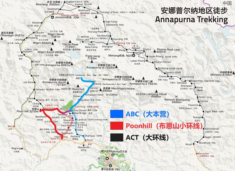 安娜普尔纳自然保护区是围绕世界第十大高峰——安娜普尔纳群峰所建立的自然景观保护区。在其中有很多条徒步线路,入门级的有poonhill小环线(3-5天)、ABC大本营线(4-6天),进阶的有ACT大环线(10天以上)等等。但所有的线路基本都是从 博卡拉 发车,前往各自起点村落开始徒步。