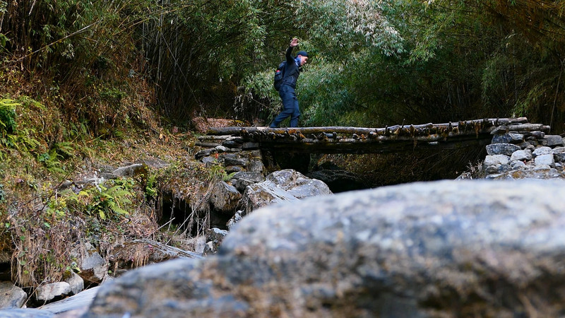 果不其然,午饭过后,天上再次乌云密布,下午又下起了淅淅沥沥的毛毛雨,ABC线路从此开始会与山谷的溪流相伴。下雨也是一种体验,更何况今天的景色更适合雨中行进,因为我们下午就要走进一片竹林深处。Bamboo区域还属于低海拔区,几乎被阔叶乔木、竹林、蕨类植物笼罩着。