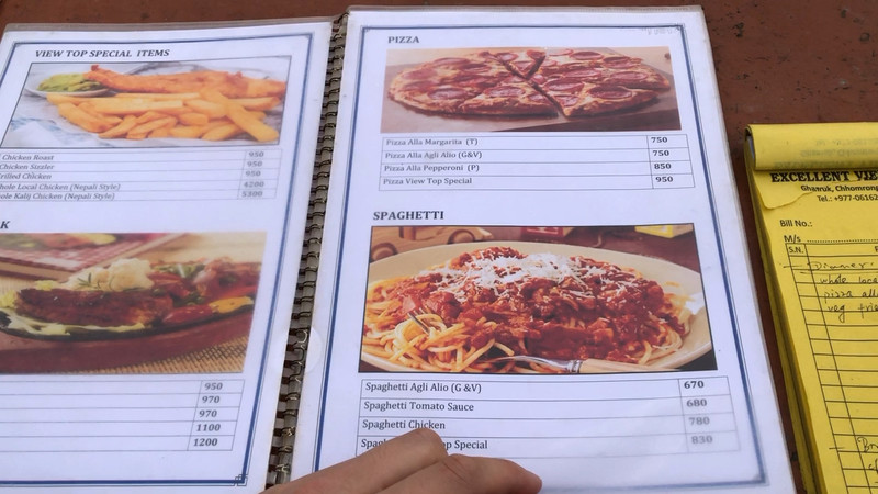 我们在半山腰的村落打尖,这也是在山上吃的第一餐,借机熟悉山上的点菜模式。进山开始,几乎每户客栈都会提供餐饮+住宿的服务,我们来的时候并不算旺季,因此是有丰富选择的。翻开菜单,基本涵盖了早餐、西餐、中餐、韩餐、小吃、水果、饮料等品类,不仅如此还会列出所能提供的服务, 比如 住宿、淋浴、用电、wifi、饮用水等都是收费项目。特别地,住宿费用并不高,如果商量好在该客栈用餐的话甚至可以免住宿费用。