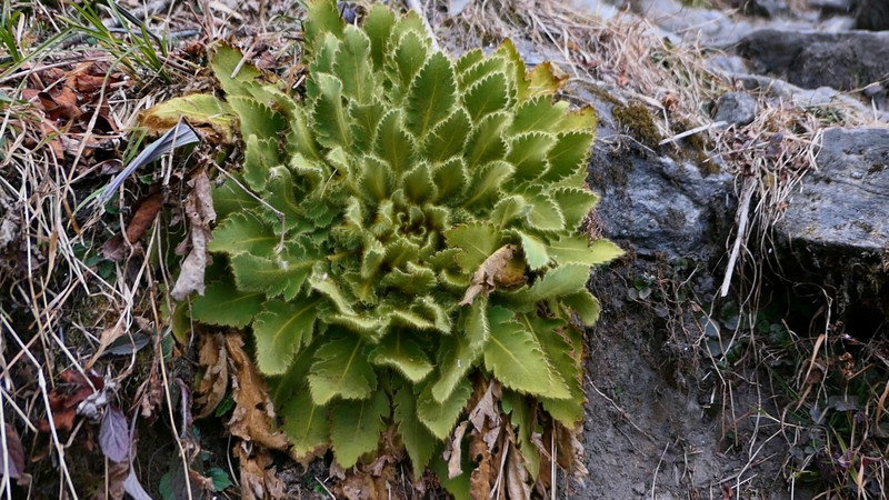 当然,午饭过后是已经习以为常的阴天下雨环节了,今天尤为特别,随着海拔的升高,冷空气直接变成了降雪,掉落下来的不是雪花而是雪粒,短短十几分钟就变成了一场席卷整个山谷的暴风雪。在这样的环境下,生态环境也和昨天有所不同,转眼间已经看不到成片的森林,取而代之的是碎石间的荒草。在沿途的上偶然能看到一朵朵绿色的像莲花一样的植物,起初我以为是高山雪莲,后经求证其名叫做锥花绿绒嵩。这是一种仅能够在藏南、 尼泊尔 见到的植物,如果你有机会来请记得关注它,它只在这片土地为你盛开。