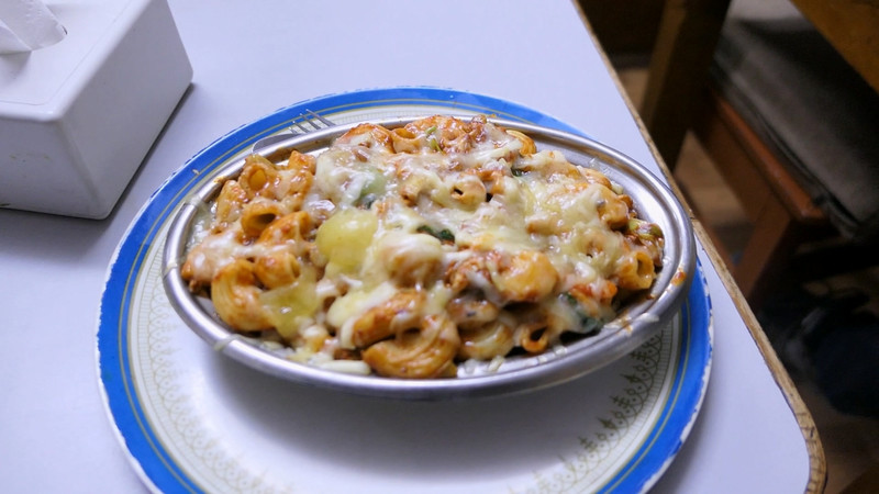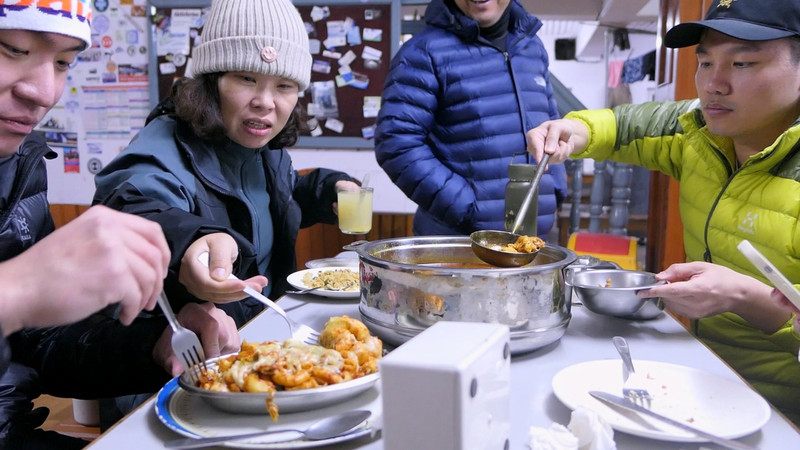 晚上六点半,我们准时开饭,老板在餐厅点起了炉子,总算是能暖和一点了。今晚大家点的各有不同,披萨、通心粉、炒面、烩鸡等等,让我们惊讶于在户外居然能有这么好的条件,在国内习惯了架锅起灶大锅饭,这一下还真有点不适应。