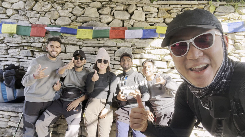 不一会,迎面走来了见到熟悉的好朋友: 尼泊尔 四兄弟!我们又在雪山下重新相聚了,也留下了见证中尼两国人民 友谊 的珍贵合照。他们的行程比我们要快一些,昨天率先走到了MBC住下,今早到ABC后开始了返程。他们的行程与我们在ABC住一晚相比有利有弊,弊端是他们需要起很早才能在日出前见到大本营的 日照 金山,但好处在于不需要在ABC的4130米海拔住宿,有效的避免了高反。