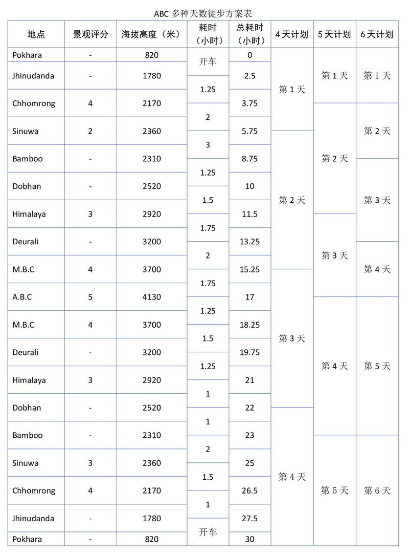 Sinuwa确实是一个风景不错的地方,远处能够遥望鱼尾峰,也将成为我们返程时的住宿地。沿途的每个住宿点并非都能有观景的机会,我也做了一份ABC 4-6天的行程规划,尽可能保证每天在下榻时都能观景。