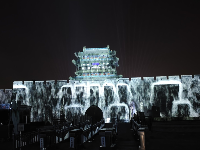 迎薰门广场外每晚八点准时开演,一古城为载体,结合现代科技展示,演出时长18分钟,提前出城