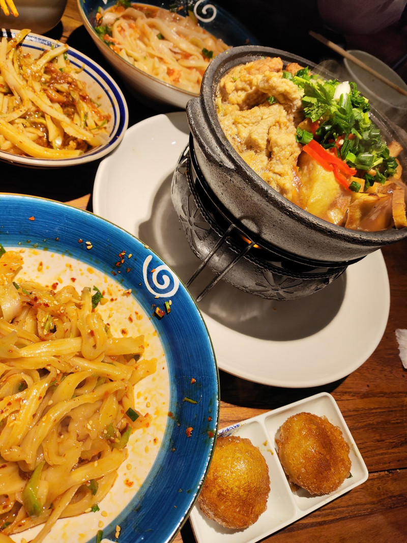 土豆、红薯、粉条、丸子、等各种配菜码在锅里,配上特制蘸料,一吃一个不吱声