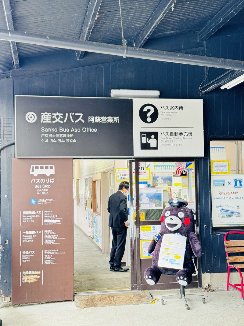 JR坐到阿苏站前-换乘公共BUS(单程票价650,车程半小时)--坐到终点站就是阿苏火山西口--天气好的话缆车开放,直接在西口买缆车票坐到火山口(来回缆车票1200,缆车时间5,6分钟)。