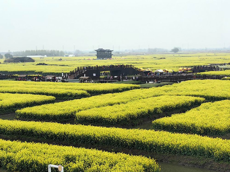 可以登上景区内的亭台楼榭上俯视整片油菜花海。照片摄于兴化千岛菜花景区。