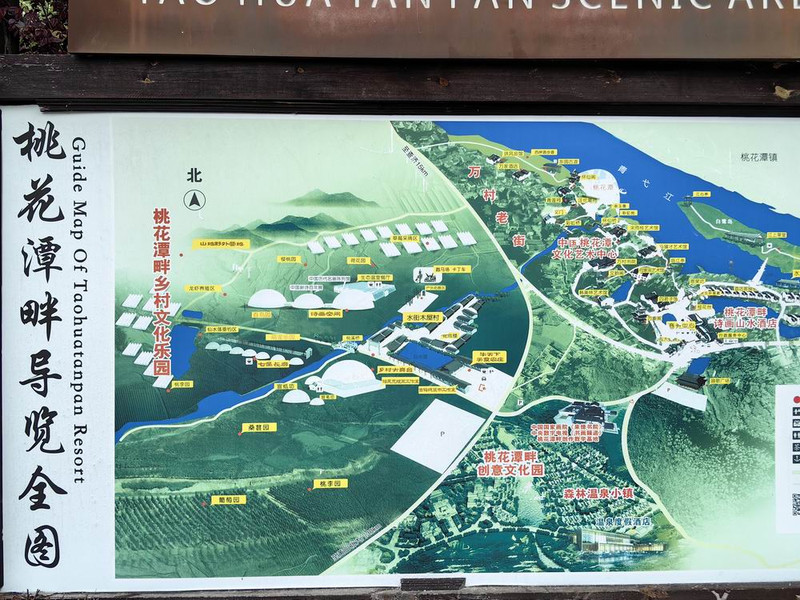 桃花潭景区内有彩虹岗、谪仙楼、钓隐台、怀仙阁、汪伦墓等景点。图为桃花潭景区的导览图。