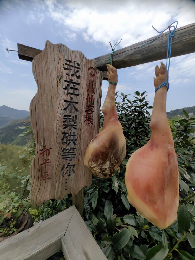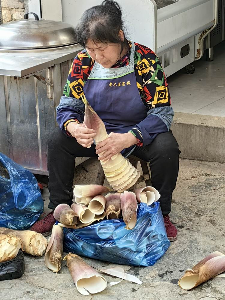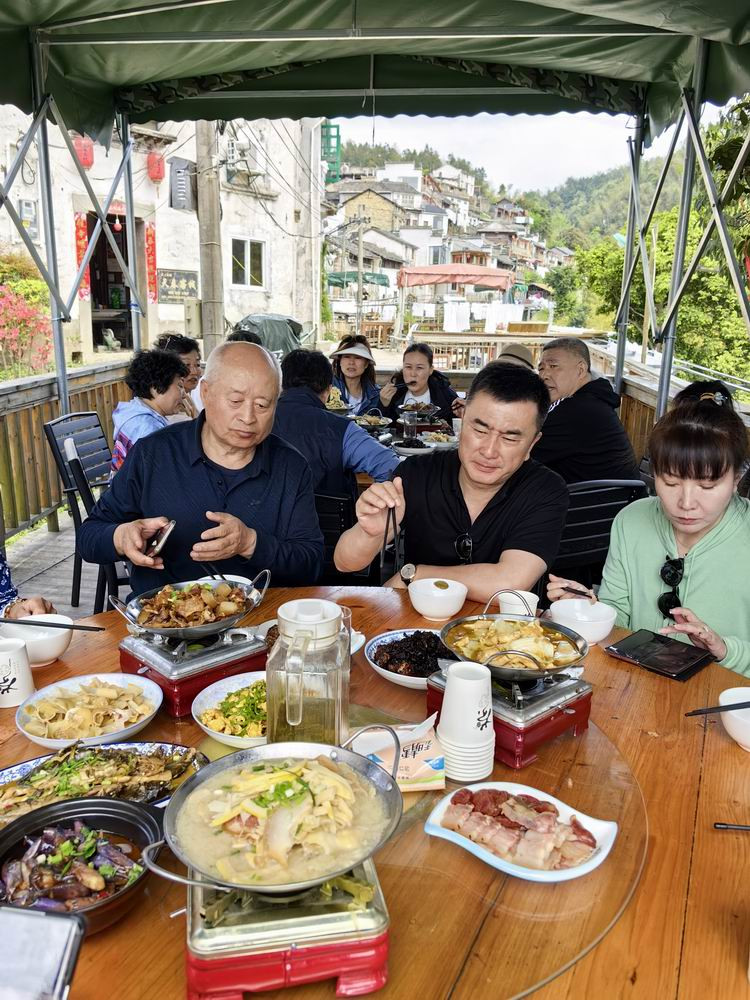 木梨硔的午餐很有特点:火腿肉炒干子,红烧肉烧笋衣,农家豆腐,清炒山芋苗,红烧茄子,海带火腿汤…..