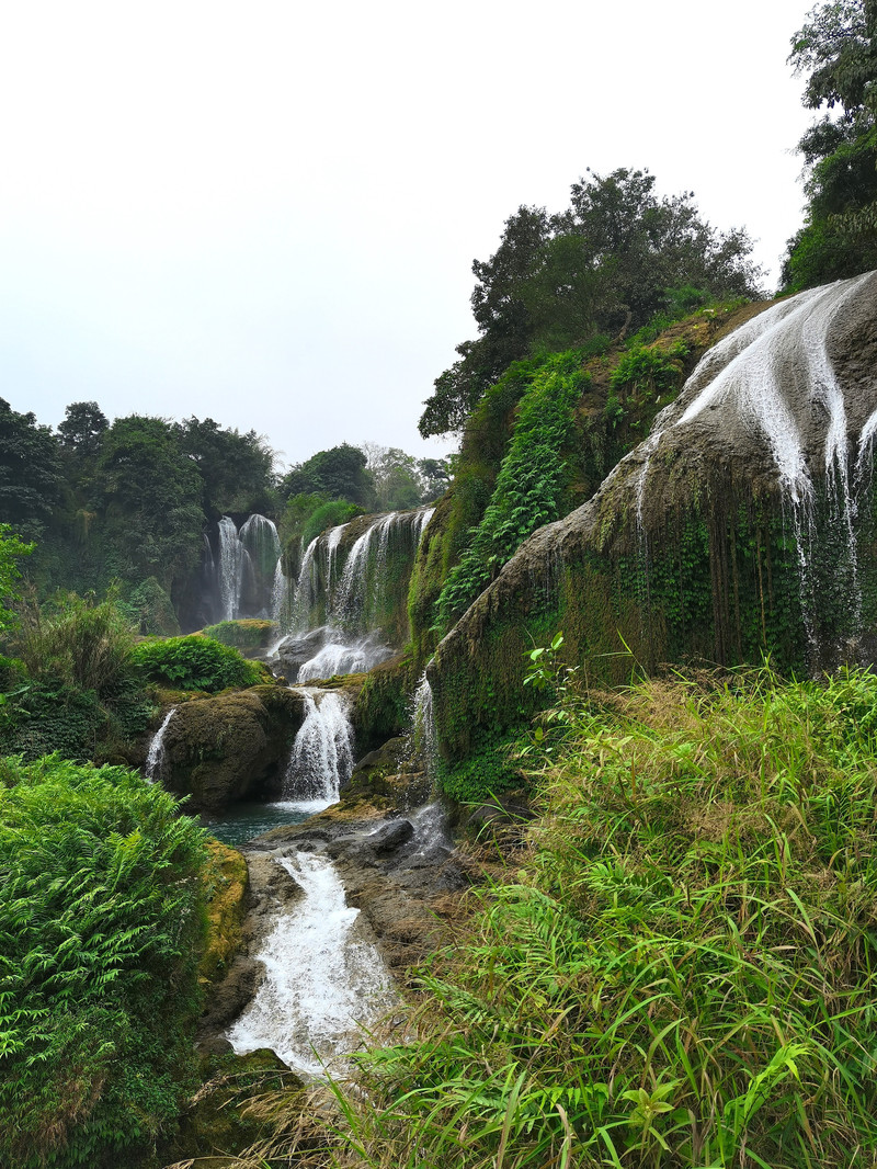 德天瀑布与越南的板约瀑布连为一体,就像一对亲密的姐妹,袅袅婷婷,携手而立。现在再看越南一侧的板约瀑布,已经不刚才所见的单股、细弱的水流,而是多道瀑布组成的集群合成。