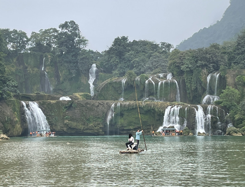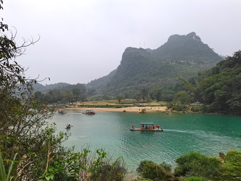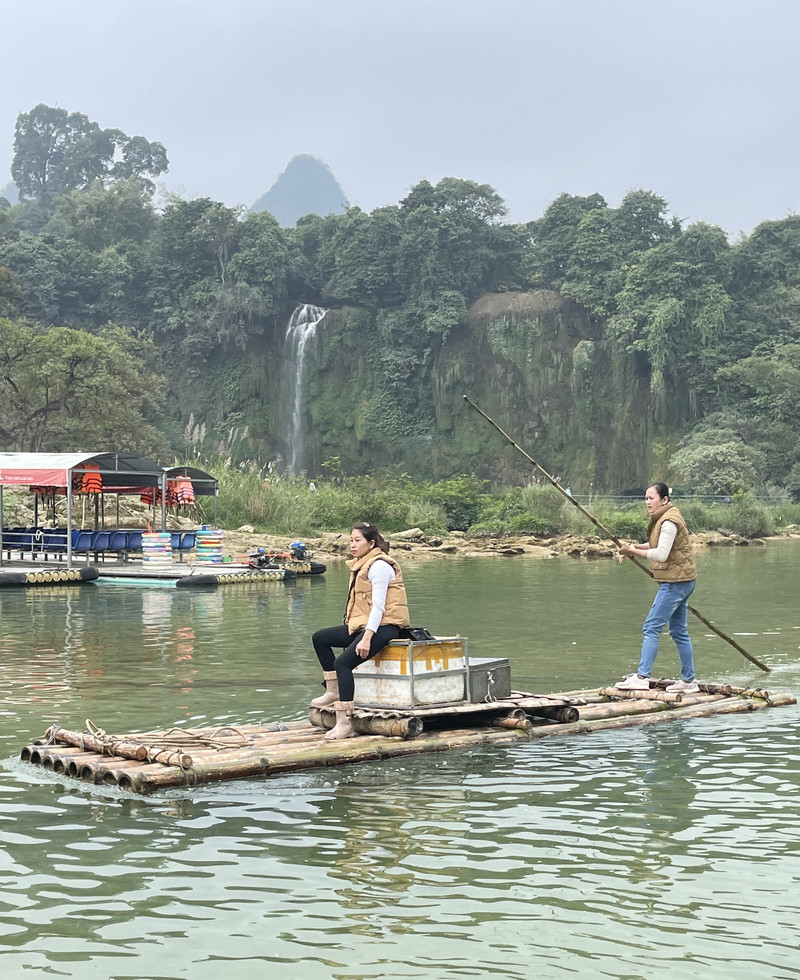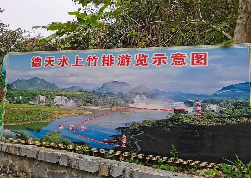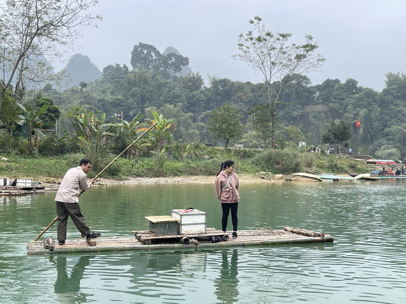 中国一侧,竹筏体量都较大,且装有推进器,筏上有编号,游客也明显地多于越南一侧。