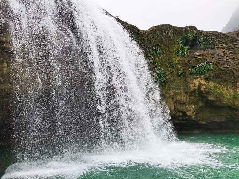 竹筏临近瀑布,水花飞溅,有风吹来,可以全身心地感受弥漫着的水雾,丝丝凉意,异常清爽。