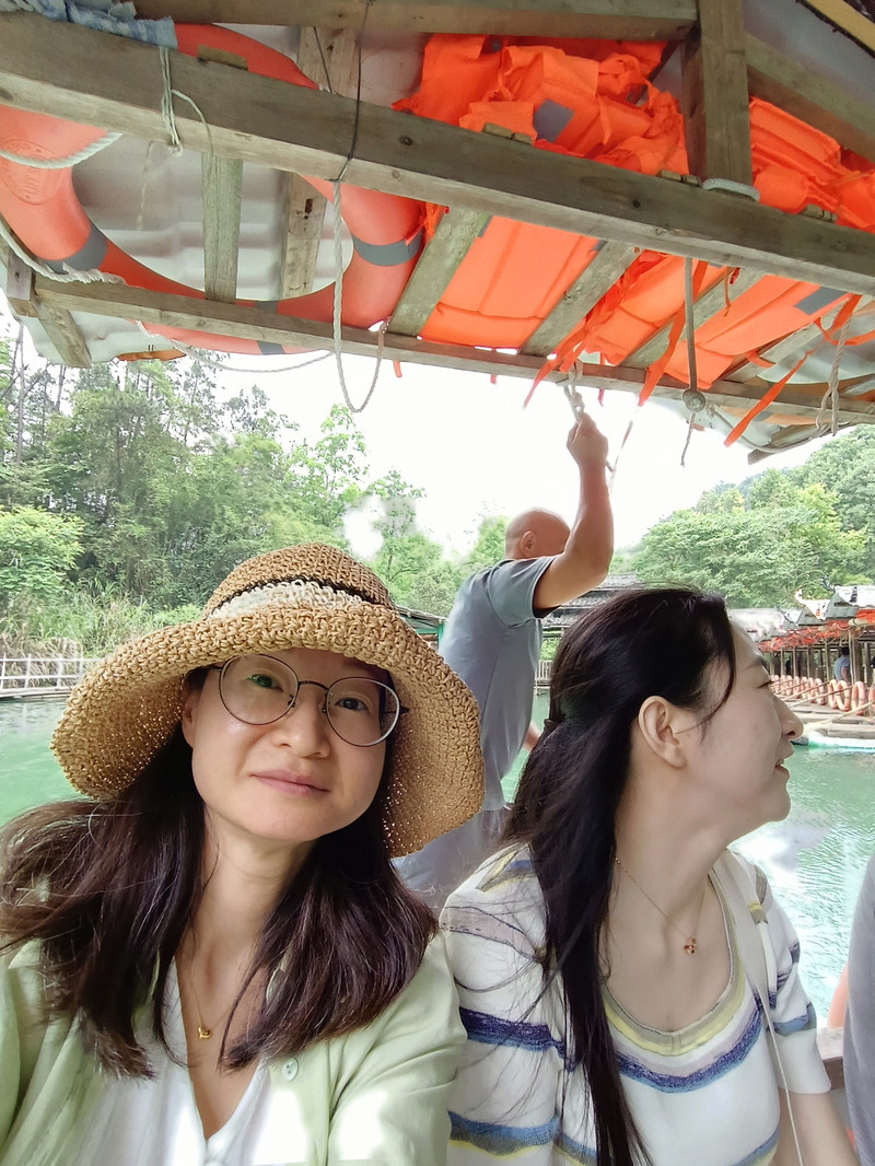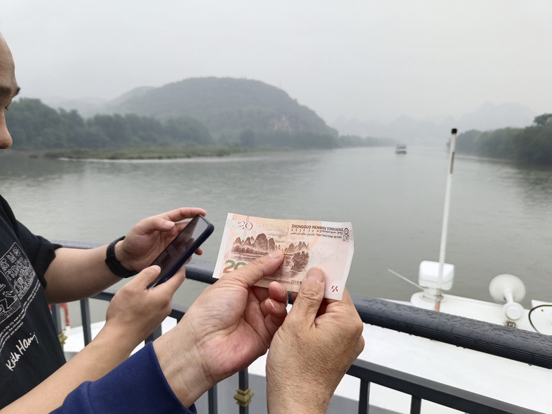 坐上漓江上的游轮,大家在找20元人民币的背面图