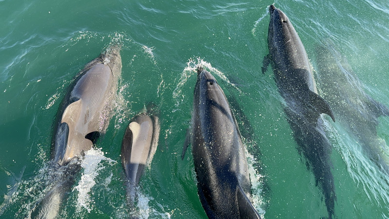 在新西兰出海观鲸和海豚有两个地方,由于行程不方便我没有选择南岛的凯库拉。奥克兰的鲸鱼海豚发现之旅的快艇每天一个班次,大约4个多小时从高架桥港穿梭在豪拉基湾。大约航行1个半小时左右,我们看到海面上成群的黑色的海鸟,大概再航行半个小时左右,会看到大约几百只的海鸥在海面上聚集飞行,有的从空中自由落体直插水面,解说提醒海豚很快会出现,接着成群的海豚跟着快艇跳来跳去,快艇的速度也降下来,大约数百只海豚在快艇周边自由表演,这一时间看到的海豚体型不是很大,跟一般的海洋馆里的海豚差不多大,但是也足够震撼,在蔚蓝大海上,海豚跟人类一起欢乐,和谐共处。在返航途中,快艇的速度非常快,基本上坐在前部甲板上都有可能被风刮倒,航行到albany ward这个区域时,成群的大海豚出现,也叫鲸豚,体重大约7到8吨,并且跟快艇进行飚速,非常刺激,而且这些海豚跳起的高度也比较高。本以为这次出海看到海豚就已经满足了,没想到看到了两批,非常满足,稍有遗憾的是鲸鱼没有看到。