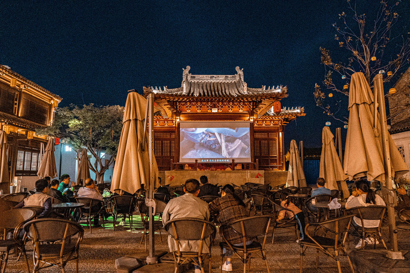 村里是有戏台的,按照以往天黑之后的戏台都回归安静,但袁家村戏台正唱一出好戏,台上正放着荧幕电影,一群人在台下围坐喝茶好不热闹。