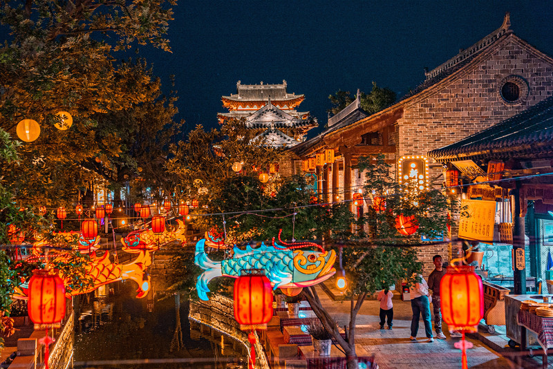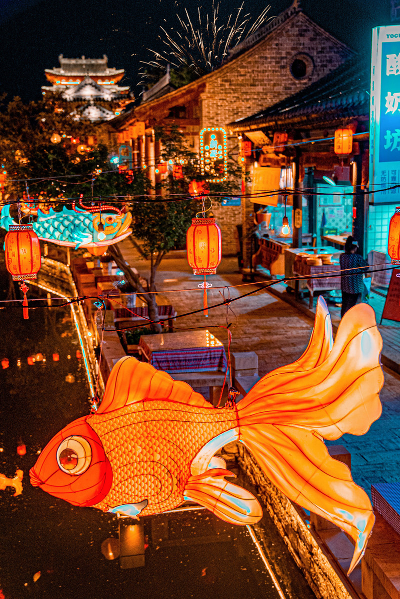宿迁袁家村立足在“朱瓦集”原址,传承了朱三太爷“兴商为民”的精神,展现了宿迁传统建筑风貌,而如今已经是充满历史文化底蕴和现代气息的仿古集市小镇啦,河上挂满了鱼灯,灯火璀璨流光溢彩。