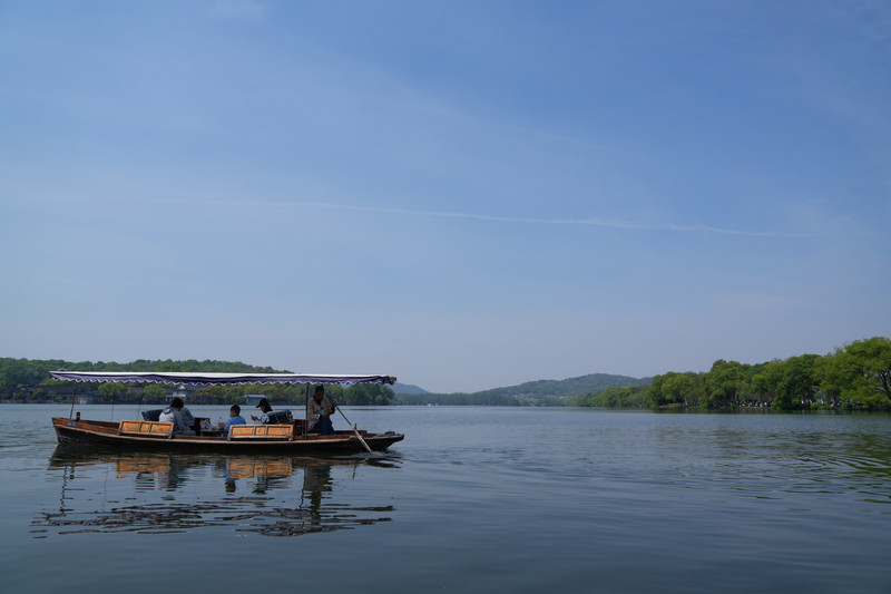 漫步苏堤,经花港观鱼,前往乘舟。余等五人,恰可乘一舟共行。遥望青山绿荫,近观波光粼粼。“水光潋滟晴方好”,扁舟缓缓,荡漾于湖光山色间,但觉心怀舒畅,与此美景,融为一体。