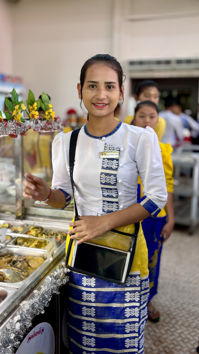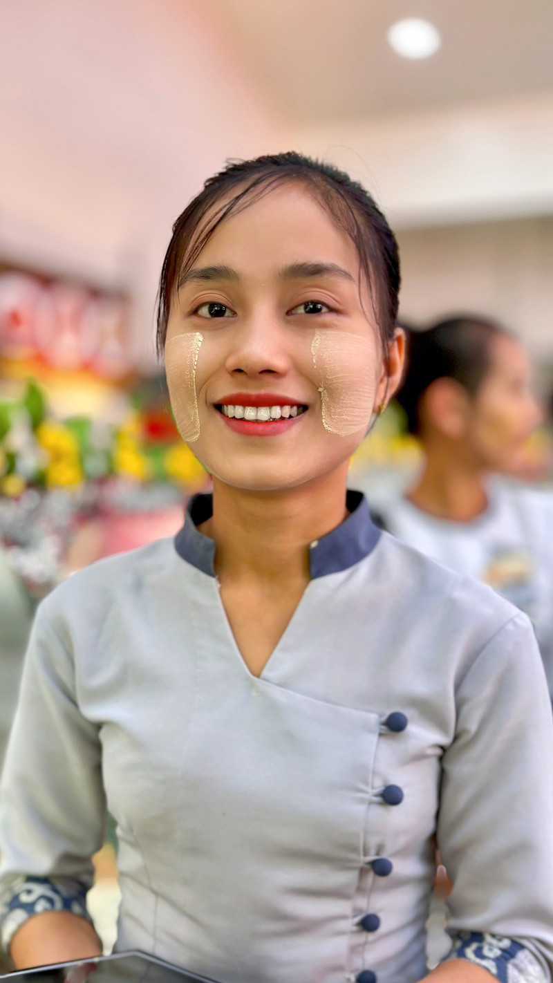 先来一个缅甸高速服务区用餐的时候,拍到的餐厅服务员。